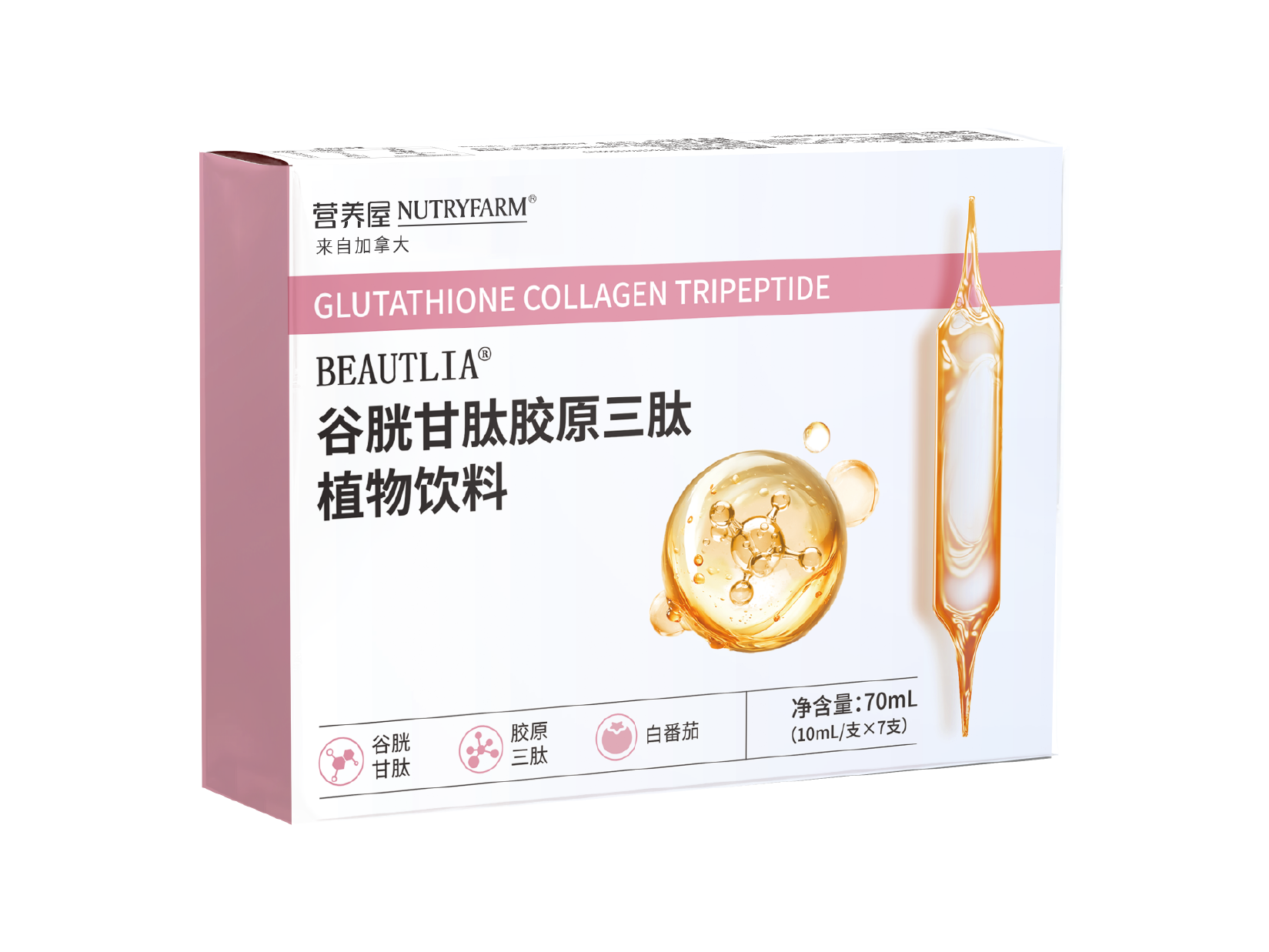 【产品类别】植物饮料【主要原料】水、胶原三肽、精制刺梨液、γ-氨基丁酸、金顶侧耳提取物、富谷胱甘肽酵母、透明质酸钠、白番茄浓缩粉、烟酰胺、三氯蔗糖、山梨酸钾【不适宜人群】婴幼儿、孕妇及哺乳期妇女【食用方法】每日3次,每次1支。本品静置可能出现沉淀,请摇匀后食用。【食用限量】γ-氨基丁酸≤500mg/天;透明质酸钠≤200mg/天【规 格】净含量70ml,10ml/支×7支